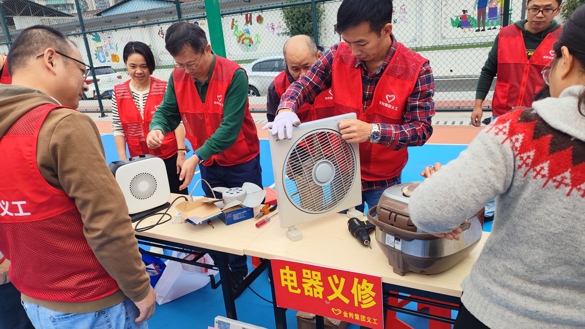 另一边,“电器义修”摊位为居民提供家电使用常识咨询、免费维修家电等服务,吸引了众多社区居民的注意。居民们拿来了家中的电暖炉、电饭煲、电风扇、电水壶等小家电给穿上红马甲的义工们“会诊”。现场志愿者们还向大家讲解家电使用和保养方法,并耐心地逐一解答了社区居民在日常使用家电过程中遇到的各种问题,活动当天,志愿者们为居民维修了20余件小家电。